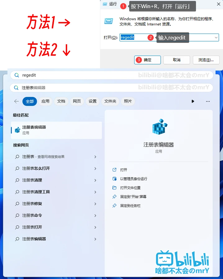 Step 1 打开 「注册表编辑器」 (方法如图二选一)