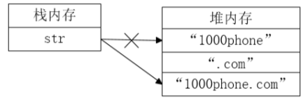 在中,可以看出创建str对象的过程中,会在虚拟机的堆内存中开辟一块区域存放字符串“1000phone”,然后,向这个字符串中添加新的“.com”字符串时,需要先开辟一块新的内存用来存放字符串“.com”,接着,再开辟一块内存存放新得到的字符串“1000phone.com”,最后,改变堆内存地址的指向,才能够完成对字符串的操作,这样的一个过程对资源造成了极大的浪费。