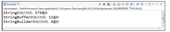在例中,分别修改String类、StringBuffer类和StringBuilder类两万次,计算执行时间,从而看出三者间的效率,从结果明显看出String类是三者中效率最差的,因为它是不可变的字符序列,StringBuffer类兼顾了效率和线程安全,StringBuilder类在三者中效率最高。