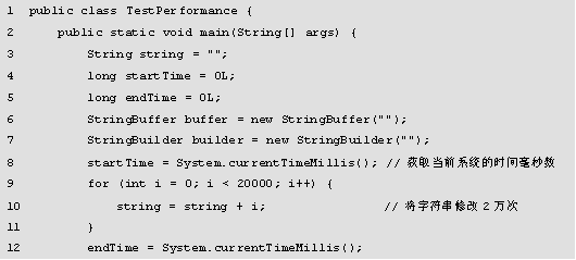 JDK5.0提供了StringBuilder类,它和StringBuffer一样,都代表可变的字符序列。与之不同的是,StringBuilder是线程不安全的,而StringBuffer是线程安全的,因此StringBuilder的效率更高。接下来通过一个案例来分析String、StringBuffer和StringBuilder的运行效率,示例代码参考。