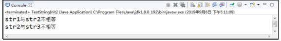 例中,创建了三个字符串,str1是用直接赋值的方式初始化,str2和str3是用构造方法初始化,比较字符串str1和str2,结果不相等,因为new关键字是在堆空间新开辟了内存,这块内存存放字符串常量的引用,所以二者地址值不相等,比较字符串str2和str3,结果不相等,原因也是str2和str3都是在堆空间中新开辟了内存,所以二者地址值不相等。