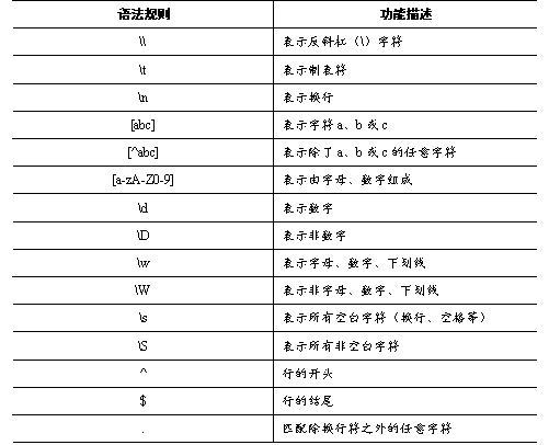 表中列出了正则表达式的基本语法规则,在String类中提供了一些支持正则表达式的方法,如表所示。