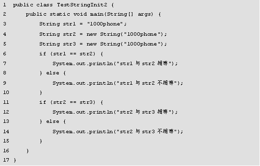 在例中,直接将字符串“1000phone”赋值给str1,初始化完成,接着初始化str2和str3,可以这样直接赋值初始化,是因为String类使用比较频繁,所以提供了这种简便操作。比较str1和str2结果是相等的,这就说明了字符串会放到常量池,如果使用相同的字符串,则引用指向同一个字符串常量,接下来讲解另一种初始化的方式。