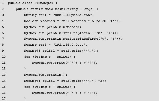 在例中,定义字符串和一个正则表达式匹配规则,该规则检测字符串是否为数字或字母,因为字符串中有“.”,不是数字或字母,所以检测后返回false,调用replaceAll(String regex, String replacement)方法,将字符串中的“w”都替换为“%”,接着调用replaceFirst(String regex, String replacement)方法将字符串中第一个“w”替换为“%”,定义另一个字符串,调用split(String regex)方法将字符串按“.”分割并遍历字符串数组,最后调用split(String regex, int limit)方法,将字符串按“.”分割,并指定limit参数分别为小于0、大于0和等于0,表中已经详细说明了limit参数的使用方法,这里就不再赘述。这就是String类对正则表达式的支持,可以方便地处理字符串,简化开发。