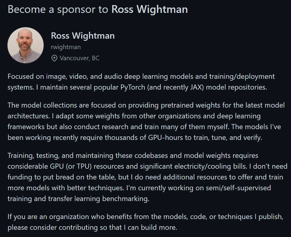 但是毫无疑问,训练、测试和维护这些代码库和模型权重需要大量的 GPU (或 TPU) 资源和大量的电力/冷却费用。Ross Wightman 也确实需要额外的资源来提供和训练更多具有更好技术的模型,所以作者打了广告邀请各界人士赞助 orz。