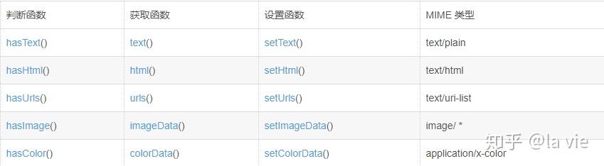 针对常见的MIME类型,QMimeData类提供了很方便的函数用于处理MIME类型数据:
