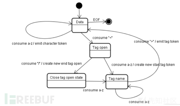 1、 初始状态为"DataState",当遇到"<"字符,状态变为"Tag open state",读取一个 a-z 的字符将产生一个开始标签符号,状态相应变为"Tag name state",一直保持这个状态直到读取到">",每个字符都附加到这个符号名上,例子中创建的是一个 html 符号。