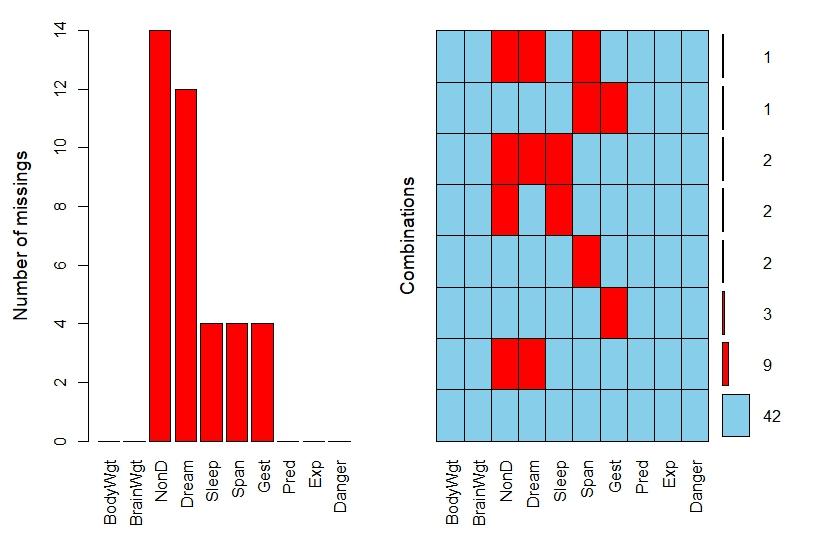 第一列表示该行模式数据的个数,该行没有缺失值,也就是在数据集sleep中,没有缺失值的数据共42条。缺失Span的数据共2条,同时缺失Dream和NonD的数据共9条。
