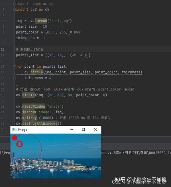 首先读取图片test.jpg,然后在for循环中,第一次画实心圆(thickness是-1),第二次画空心圆(thickness是4),并且组成圆的线条的粗细程度是4。接着画一个半径是60的圆。