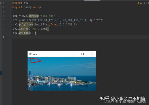 首先读取test.jpg,然后定义一个点集数组Pts,接着调用polylines绘制多边形,最后显示出来。