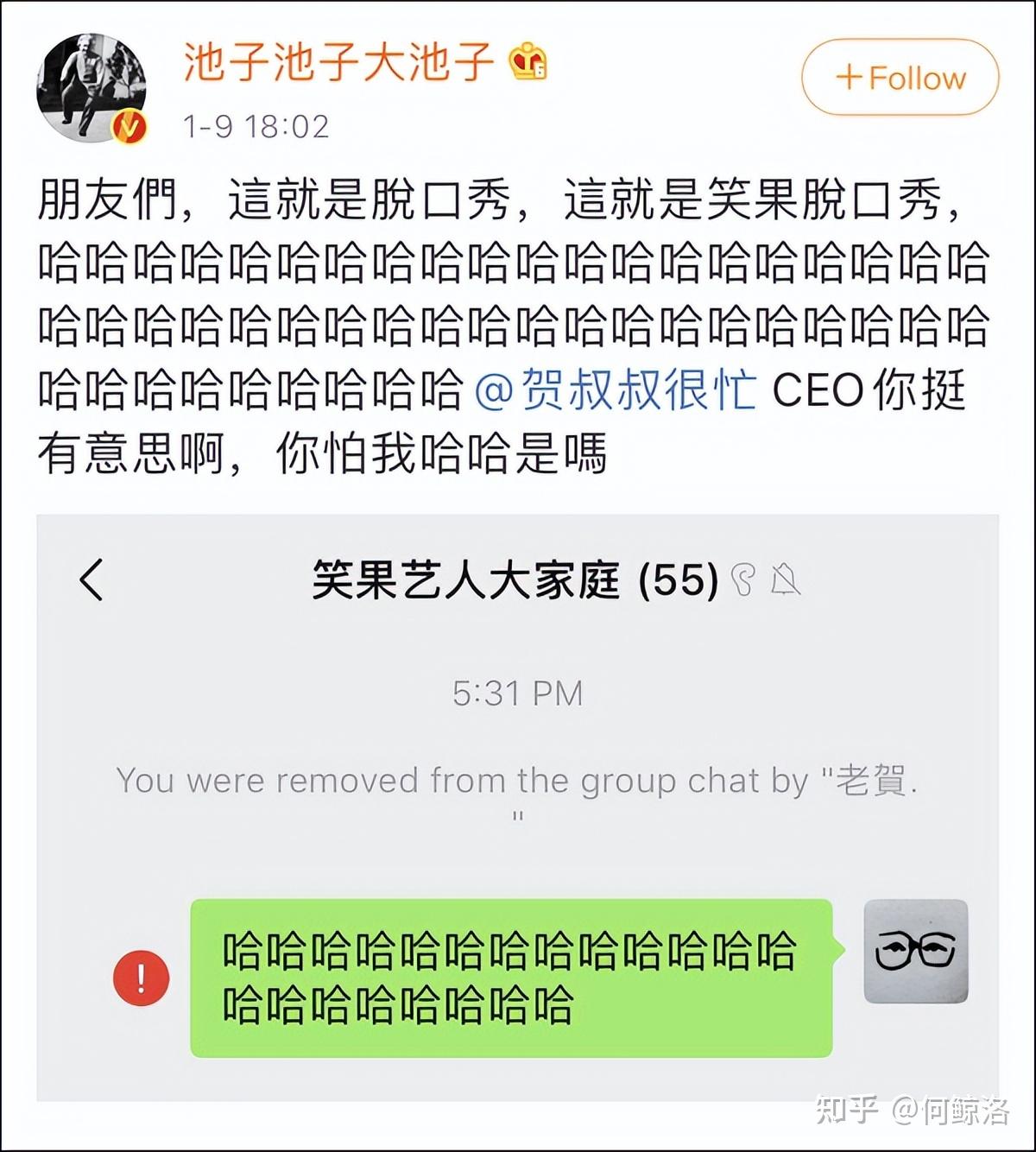 他晒出了被《吐槽大会》出品方笑果文化CEO贺晓曦移出群聊的截图,并配文。