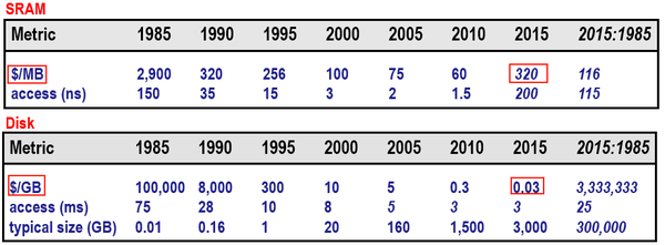 答案是可以的。但是,缓存的造价太贵了。具体如下图所示。以2015年的售价为例,1GB SRAM的价格大约为327680美元,而1GB 普通硬盘的价格仅仅为0.03美元。用缓存来存储程序成本太高了,得不偿失。