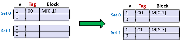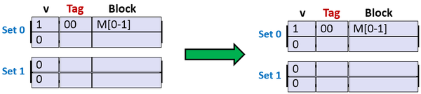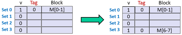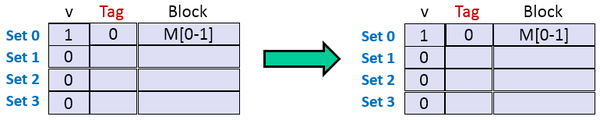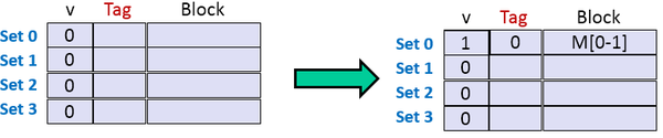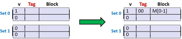 5. 读地址0的数据。标记位为0,索引位为00,偏移位为0,块号为0。缓存行中有数据,组0的有效位为1,地址的标记位和组0的标记位不匹配,因此,未命中。然后,高速缓存从内存中取出块0,块1, 共2字节,并存储在组0中。具体如下图所示。