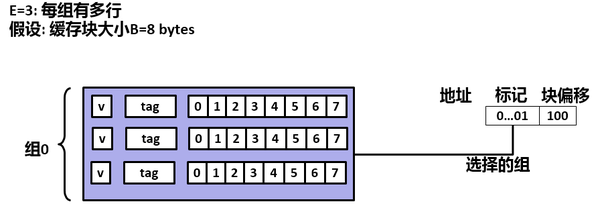 它的组选择与直接映射高速缓存的组选择一样,组索引位标识组。具体如下图所示,这里不再赘述。