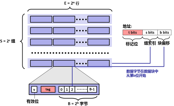 一般而言,高速缓存的结构可以用元组(S,E,B,m)来描述。高速缓存的大小(或容量)C指的是所有块的大小的和。标记位和有效位不包括在内 。因此,C=S×E×B。