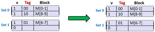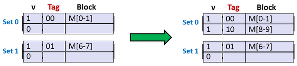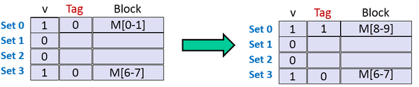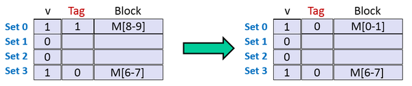 观察以上过程其实可以发现,在第5步,读地址0的数据的时候,我们又得重新从内存中取数据到缓存行中。 在读地址8的数据的时候,M[8-9]替换了缓存行中的M[0-1]。