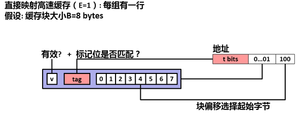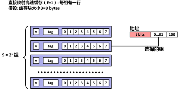 上面我们介绍了计算机中的高速缓存模型,我们可以根据每个组的高速缓存行数E,将高速缓存分成不同的类型。下面我们看下直接映射高速缓存(E=1)的具体例子。