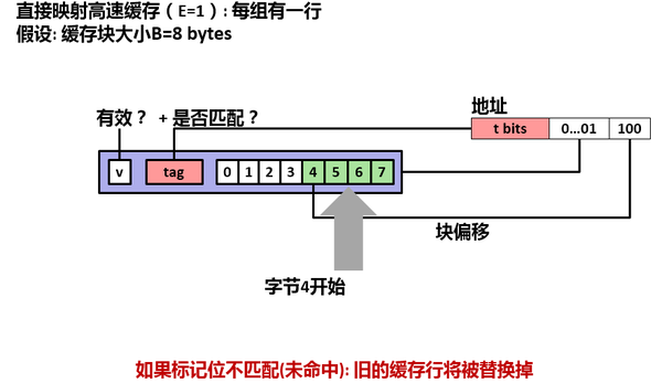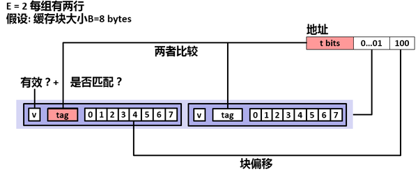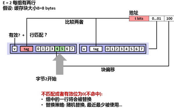行匹配 :根据地址划分,可得到t位的标志位,由于组内的任意一行都可以包含任意映射到该组的数据块,所以就要线性搜索组中的每一行,判断是否有和标志位匹配且设置了有效位的行 ,如果存在,则缓存命中,否则缓冲不命中。