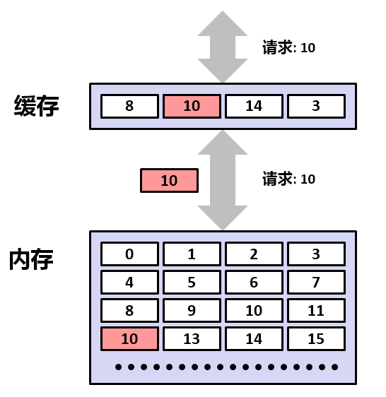 2.高速缓存中有数据块,但没有数据块10,这叫做缓存不命中 。接下来缓存请求主存将该块复制到高速缓存,高速缓存接收到之后将替换一个现有的数据块,从而存储新的数据块在高速缓存中。最后,高速缓存将数据块10返回给CPU。