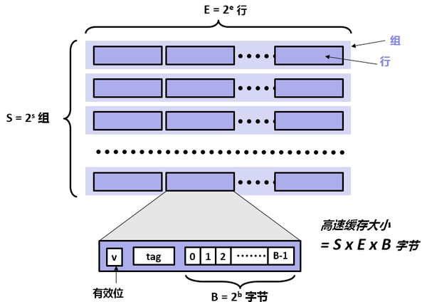 我们可以将高速缓存存储器视为有$S = {2^s}$个高速缓存组的数组 。每个组包含$E = {2^e}$个高速缓存行 。每个行是由一个$B = {2^b}$字节的数据块组成的。