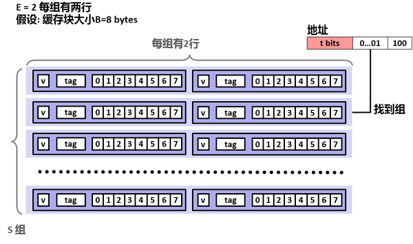 组选择示意图如下所示。假设有 S 组,每组由一行组成,缓存块为8字节。CPU发出地址要取数据字,高速缓存将该地址分解为三部分,对于图中的地址来说,块偏移量为4。组索引是 1 ,粉红色的为t位标记位。 因此,高速缓存提取的组索引为 1,即图中第二行。