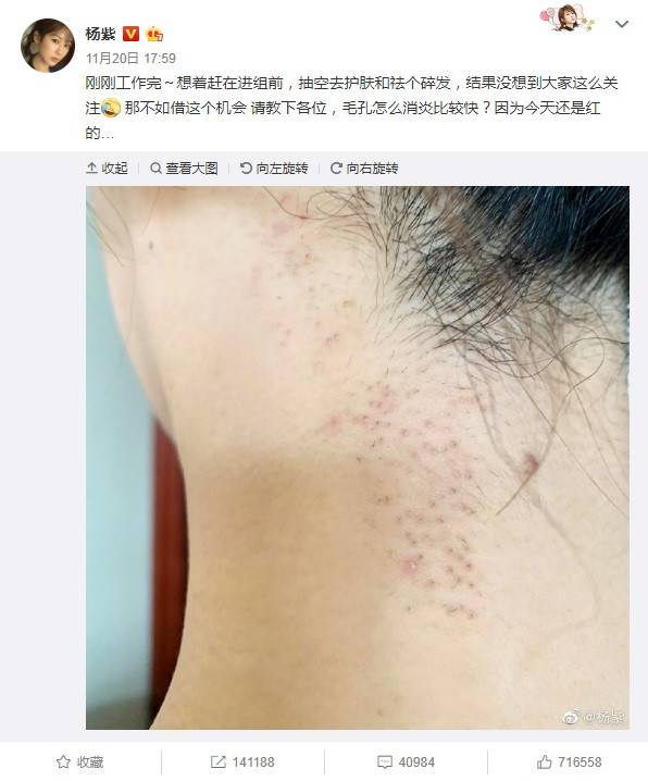 楊紫的情商真的很高,她立刻坦然地回應:「剛剛工作完~想著趕在進組前,抽空去護膚和祛個碎髮,結果沒想到大家這麼關注,那不如藉這個機會請教下各位,毛孔怎麼消炎比較快?因為今天還是紅的…」落落大方的態度讓酸民馬上閉嘴。