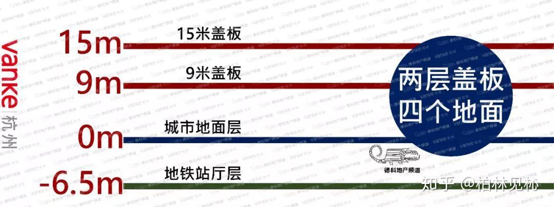 这么复杂的天空之城,首先要明白「两层盖板,四个地面」。 哪四个地面?地铁站厅层在地下 -6.5 米;我们城市道路空间,是 0 米层;在这上面有一个 9 米的盖板;再上面,还有个 15 米的盖板。