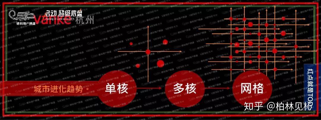 城市进化的趋势是什么?过去是单核,现在是多核,未来是网格。如果有一些专家告诉你,说城市未来进化的方向是多核城市——废话。我们要知道多核之后是网格,我们必将迎来网格化的城市。而网格上的那些红点,就是 TOD。万科跟杭州地铁集团一起开发的天空之城,只是其中的一个红点而已。