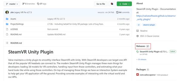如果开发的项目需要使用早期的插件版本,比如需要使用SteamVR 1.2.3结合VRTK 3.x进行开发的情况——我们知道VRTK在Asset Store中的最新版本(3.x)并不能与SteamVR Plugin 的最新版本(2.x)搭配使用,所以遇到这种情况,只能从Github中下载SteamVR Plugin的旧版本,同理,对于VRTK来说也适用。