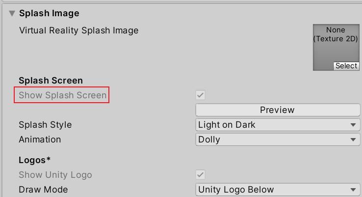 开发者可以根据项目需求选择接受或忽略对应设置选项,通常情况下,点击窗口底部的Accept All接受所有建议即可。需要注意的是,即使点击Accept All 按钮,在未来的开发过程中,当项目脚本发生改变时,该设置对话框依然会再次弹出,只是在建议设置列表中,仅显示如上图所示的第一项——Show Unity Splashscreen,并建议关闭。接受该选项的目的是关闭显示Unity的启动画面(Splash Screen),而对于个人版Personal用户来说,该选项并不能在Build Settings中将其禁用,如下图所示: