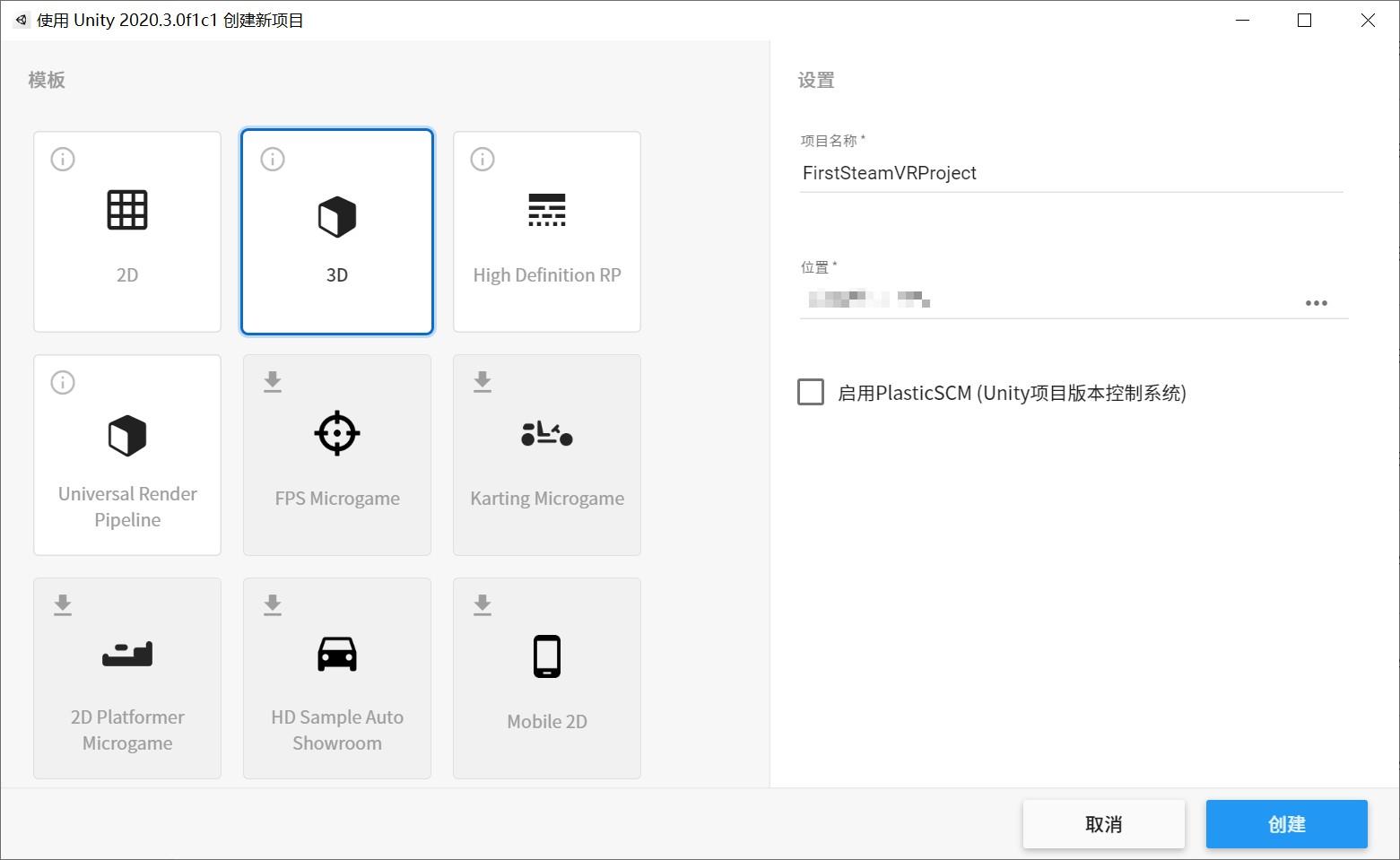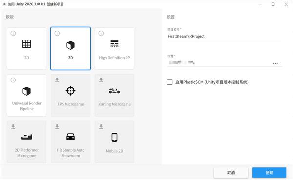 在Unity Hub中,使用Unity 2020创建一个3D项目,如图5所示: