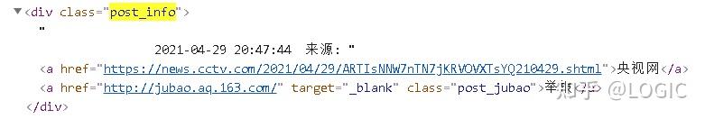 获取新闻来源:观察新闻URL网页HTML代码,发现class为post_info的div标签的第一个子节点中存储新闻来源信息,可以使用class索引。