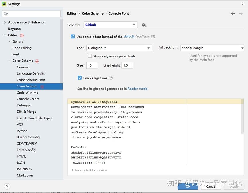 ③在settings设置中单击Editor进入下一层Color Scheme,再单击Console Font,出现如下页面;