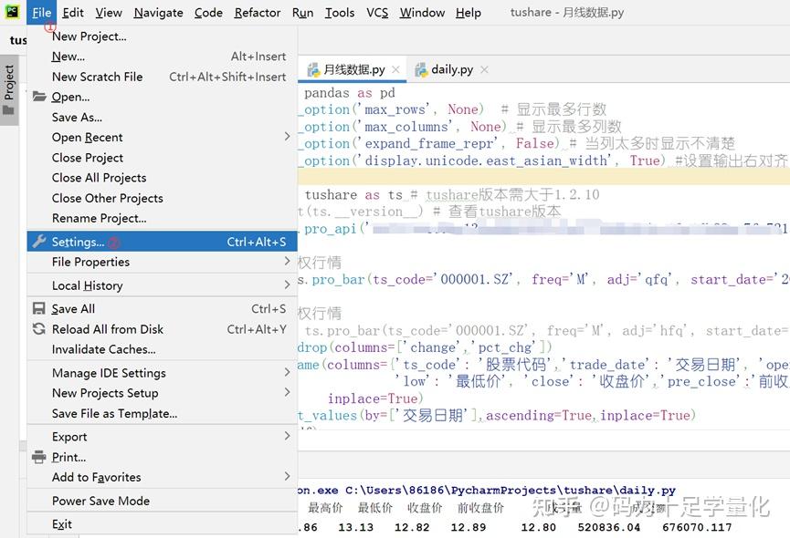 ② 单击Pycharm编辑器File键,再点击settings设置;