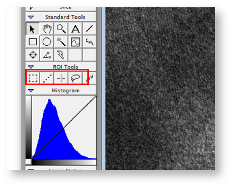 图6为强度直方图“Histogram”窗口,用鼠标选择位于右边的强度峰(点击峰的左端,按下鼠标并拖至峰的右端)。这个操作改变了上面提到的图像与显示器之间的相互关系,从而改变了图像的显示。双击直方图窗口下端的灰度横带(红框中)可以复原直方图的初始显示值。