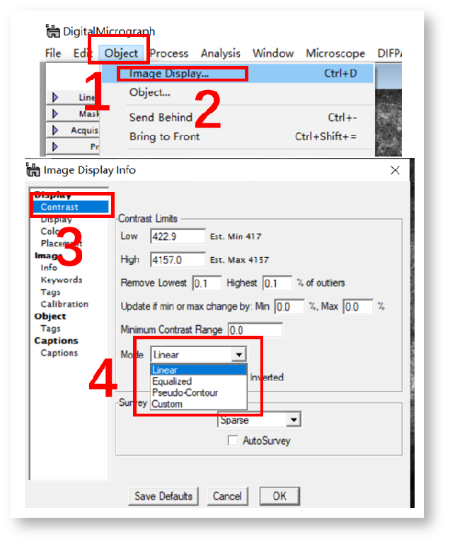 强度直方图窗口中的曲线称为“衬度变换曲线”(即上面提到的图像与显示器之间的强度对应关系)。在线性模式里,它是一条直线,在“gamma”显示模式中,它变为非线性关系。此外通过选择 Image Display(也可以通过快捷键Ctrl+D),也可以把线性模式变为非线性。