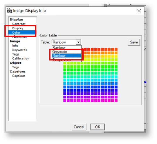 如图8所示,在“Object”菜单下,选择“Image Display”,再选择“Display”下的“Color”。在彩色配置表(Color Table)下,选择彩虹(Rainbow),点击OK退出。此时图像在伪彩模式下显示。图中的彩色方块矩阵就是上面所说的黑白-彩色配置表,可以用亮度或衬度划尺来改变图像的显示效果。再回到图像显示“Image Display”,选择“Display”下的“Color”,选择温度“Temperature”,点击 OK 退出。注意现在的彩色方块矩阵(黑白-彩色配置表)已经变了。