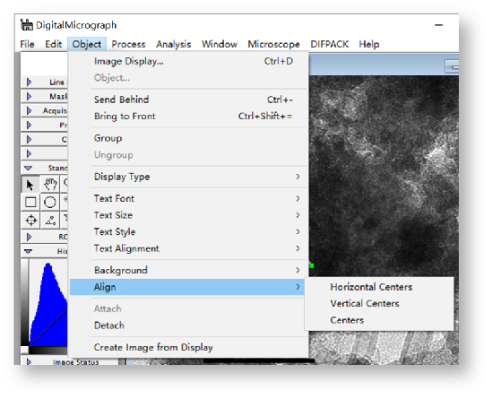 图像中的各种注释物体(例如文字,或几何图形,例如线段,方形,圆形等等),经常有必要将它们做有规则的排列。在DM软件中可以将这些注释物体按水平中心线,竖直中心线,或中心点排列。如图10所示,选择所有的注释物体(按下鼠标画一个虚设的方形区来包围所有的注释物体;或按下移动键“Shift”, 点击来选择每个注释物体),被选择后的注释物体,端点变为绿色。在物体“Object”菜单下,选择“Align”的类型,即可选择排列方式。