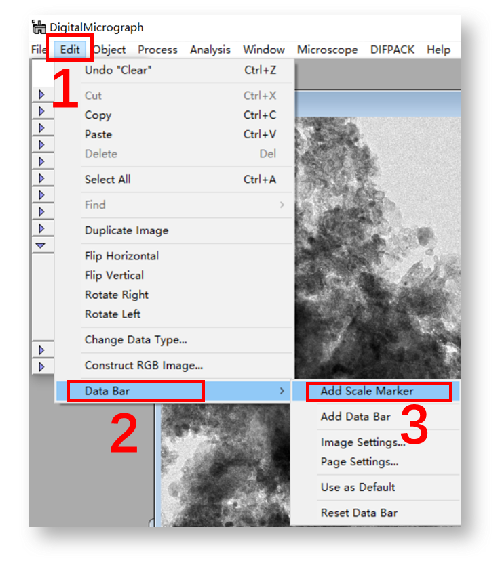 标尺对于电子显微图像来说至关重要。使用预先储存的电镜放大倍数校正表,DM软件会对从CCD相机采集的每一幅图像进行自动校正。图像被校正后,DM软件自动显示图像的标尺。但是如果被显示的图像没有带标尺,可以按照下面的步骤来显示标尺(图14)。