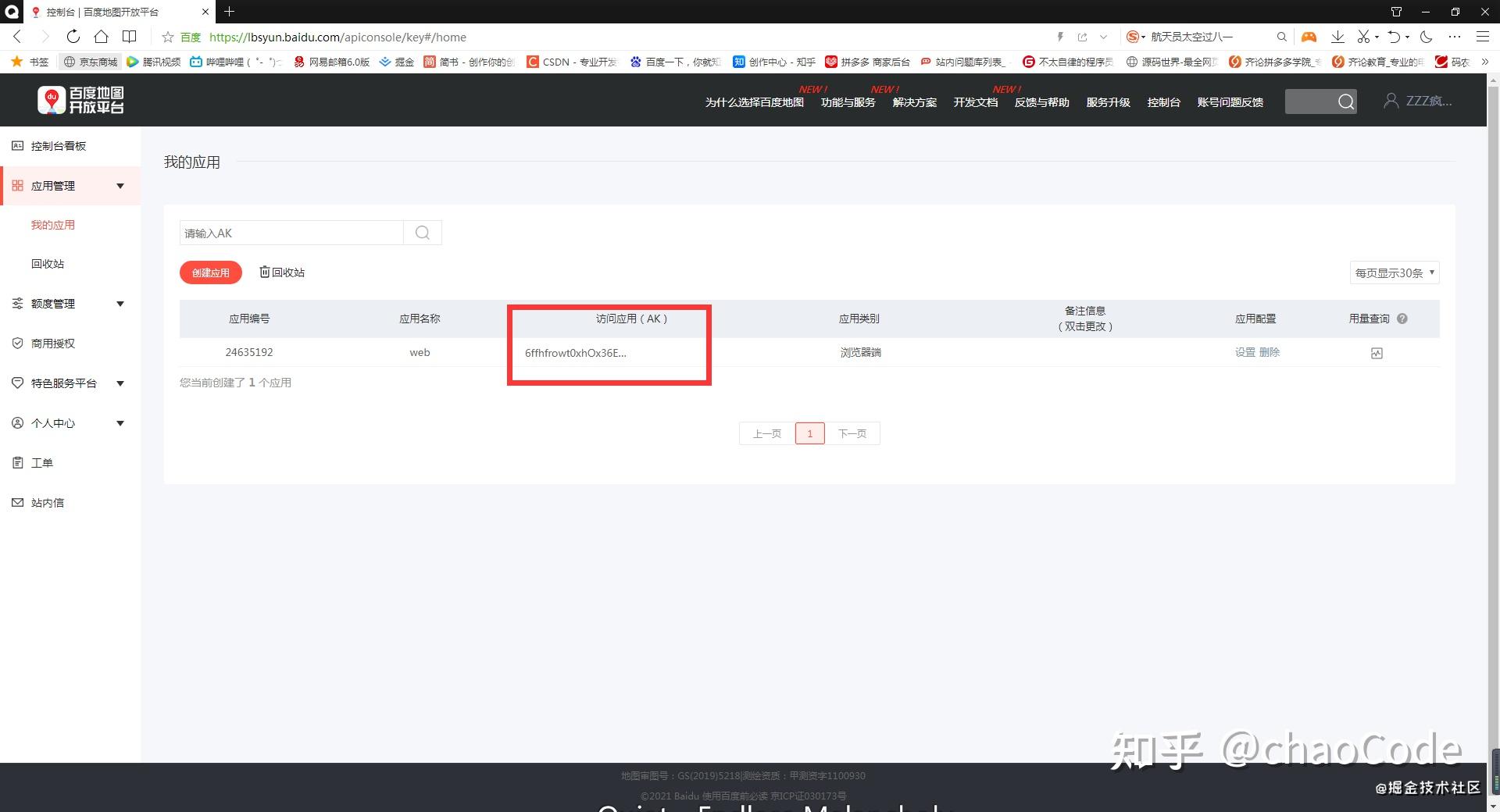 在使用百度地图之前,我们需要拥有一个自己的百度账号,申请注册成为百度开发者,然后我们需要创建一个浏览器端应用,就可以获取到一个唯一的服务秘钥(AK)
