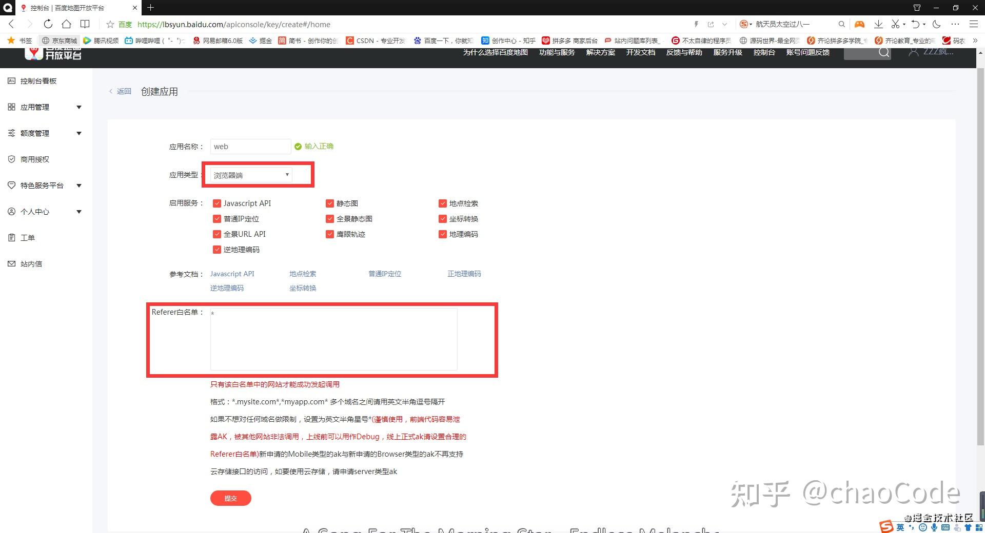 2. 在创建应用的时候我们需要注意应用类型需要我们需要的类型,因为我的是web项目需要,所以这个应用类型我选择的是浏览器端,还有其他应用类型,根据自己的需要自行选择。还有就是这个Referer白名单的设置,根据自己的需求,按照下面的提示,自行配置,这里我为了方便是没有对任何域名做限制,使用的是*