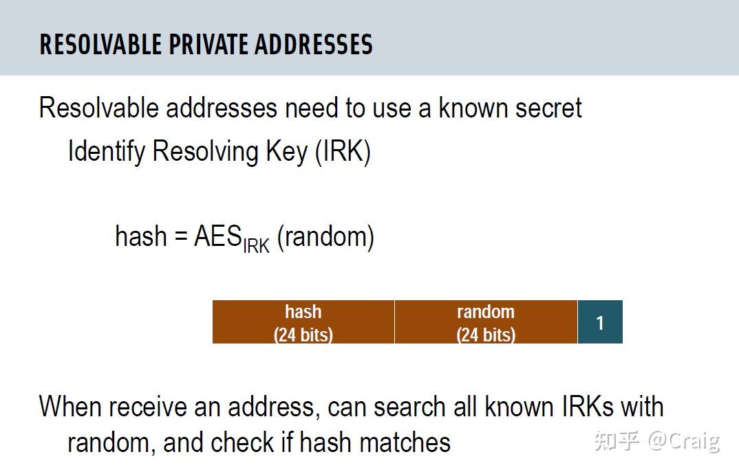 如果要使用 Private Random Resolvable,通信双方必须同时具备相同的安全信息以及哈希方法。在低功耗蓝牙中,经过配对并且绑定的通信双方会共享 IRK(Identify Resolving Key)来计算具体的哈希值,并通过比对哈希值来判断该设备是否为之前绑定过的设备。