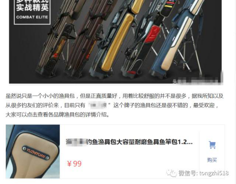 有次我打开头条点了一篇关于钓鱼的文章,钓鱼也是我的一个爱好,他的标题很吸引人,大意是怎么去选择钓鱼饵料,点开看了一下,文章内容确实不错,看着看着也没跳出,一直到文章末尾,看到这样一个链接,是一款渔具包,点开之后是一个淘宝店铺。