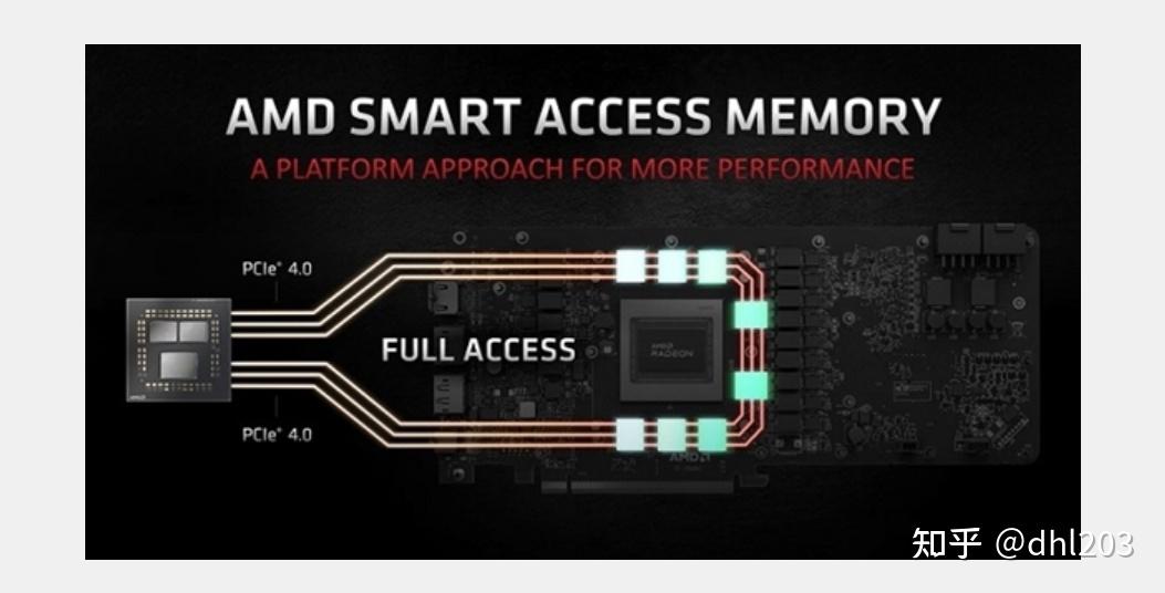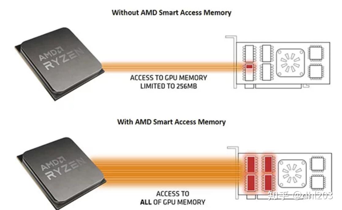 AMD SAM是AMD在RDNA 2上提出的创新功能。在启用了这个功能后,锐龙5000系列CPU端可以直接通过PCIe 4.0总线访问GPU的全部本地显存,这样一来,CPU就可以直接调用GPU的数据而不需要等待GPU转发。SAM本质上利用的是PCIE规范中的一个特性,之前不被厂商注意而已。