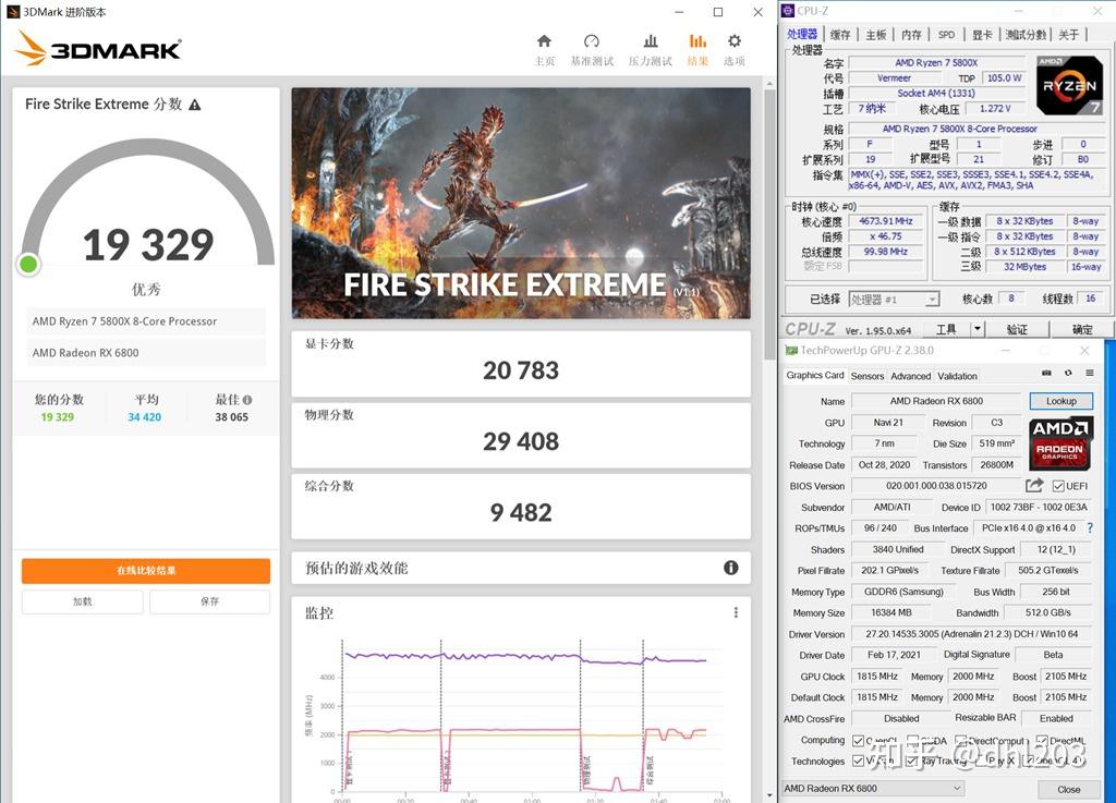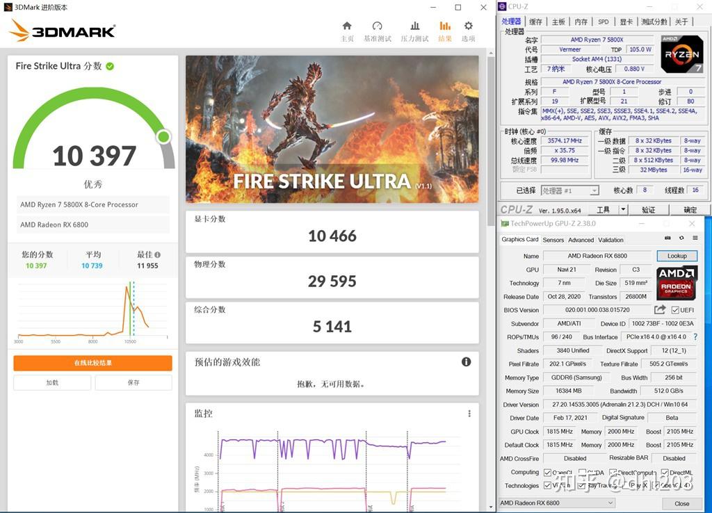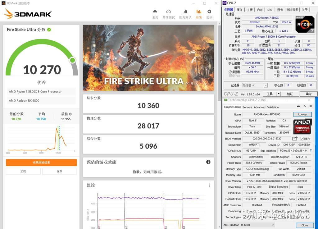 通过各个基准测试来看,在5800X的加持下,即使打开SAM功能,显卡的理论测试分数提高也并不明显,更多的数据差别也可以近似认为是系统误差,这极其有可能和3DMARK FIRE STRIKE的运行机制有关。