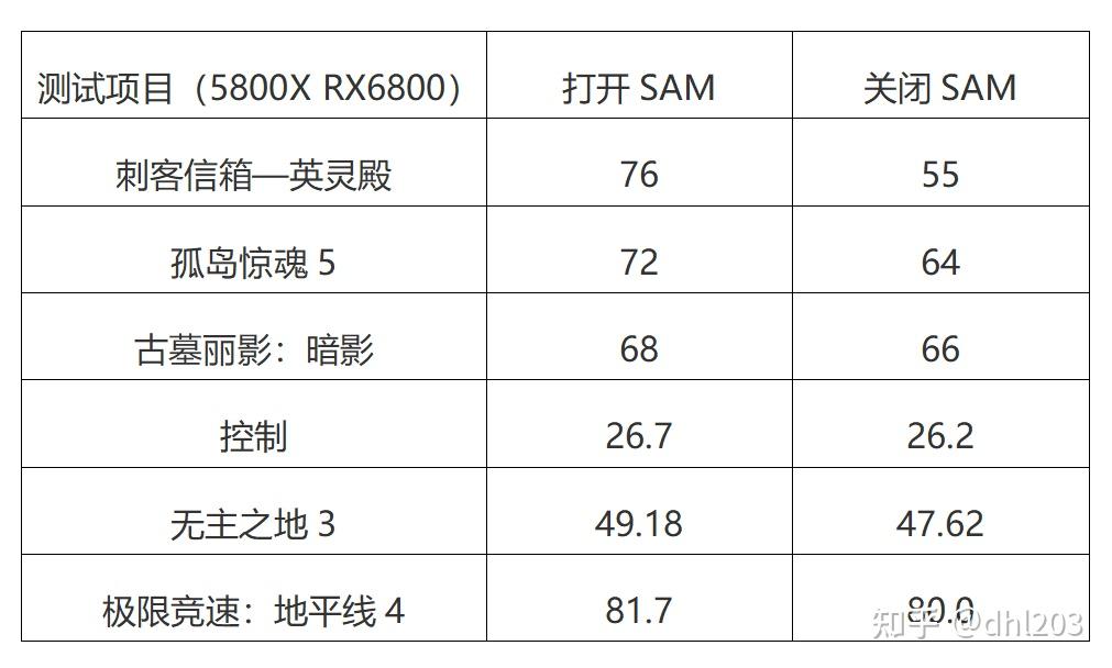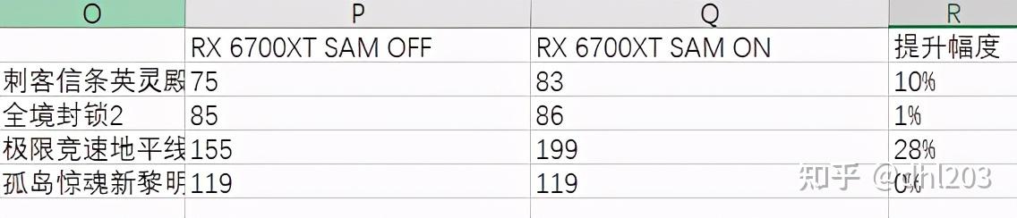 首先展示一下,从网上搜索到的一组RX6700XT打开和关闭SAM后的性能对比