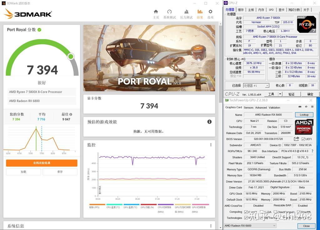 使用了AMD公版原厂RX6800来进行测试,RX6800核心为NAVI 21,渲染单元单元3840个,光栅单元96个,纹理单元240个,默认频率1815MHz,BOOST频率2105MHz。显卡位宽256Bit,显存容量16GB,规格GDDR6,等效频率16000MHz。