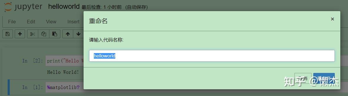 请注意,在浏览器中关闭notebook选项卡 不会 像在传统应用程序中关闭文档 那样 “关闭”notebook。notebook的kernel将继续在后台运行,在管理界面看到 notebook 还是绿色状态就表明其在运行,并且需要在真正关闭之前关闭它-尽管如果不小心关闭了标签页或浏览器,这非常方便!
