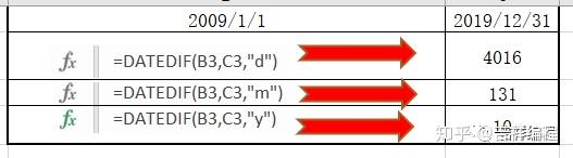 使用函数datedif计算两个日期间隔的天\月\年数,函数第3个参数("d"代表天,"m"代表月,"y"代表年),见下图;