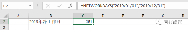 使用函数networkdays(start_date,end_date,holidays),返回起始日start_date和截止日end_date之间的净工作日天数(不包含holidays),例如:计算2019/1/1至2019/12/31的净工作日,见下图;